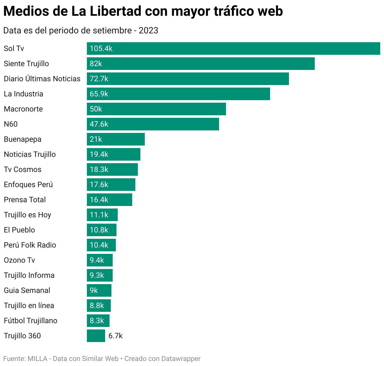 Las páginas de noticias de la región con más visitas en setiembre fueron Sol Tv con 105.400, seguido de Siente Trujillo (82.000), Diario Últimas Noticias (72.700), La Industria (65.900) y Macronorte (50.000).